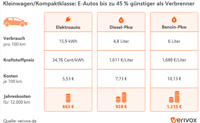Bei Kompaktfahrzeugen und Kleinwagen fielen die mittleren Bedarfe alles in allem geringer aus (Strom 15,9 kWh pro 100 km, Benzin 6 Liter pro 100 km, Diesel 4,8 Liter je100 km). Aber ebenso dort bewegten sich Elektroautos im Verhältnis zu Benzinern noch 45 Prozent und im Verhältnis zu Dieselfahrzeugen 29 Prozent billiger.