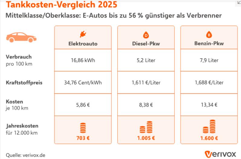 E-Autos tankten 2025 bis 56 Prozent billiger als Verbrenner