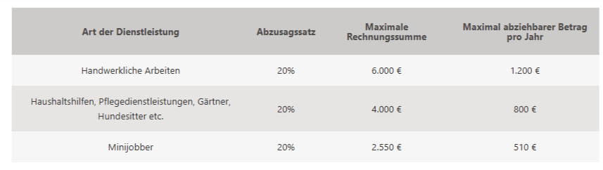Für Hundebetreuer, Gärtner, Haushaltshilfen, Pflegedienstleistungen und Weiteres liegt der Höchstwert auch bei 20 Prozent, jedoch bei maximal 4.000 Euro. Geht es bei dem Erbringer einer Dienstleistung um einen Minijobber, verringert sich der abzugsfähige Maximalbetrag auf 510 Euro pro Jahr, ebenso auf Basis von 20 Prozent.