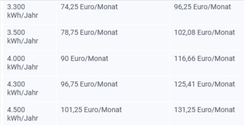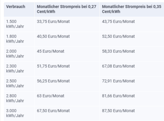 Um das für jeden verständlich zu machen, hat t-online hier eimal kalkuliert, was du bei einem Arbeitspreis von 27 Cent und 35 Cent (je nach Bedarf) monatlich für Strom bezahlen müsstest.